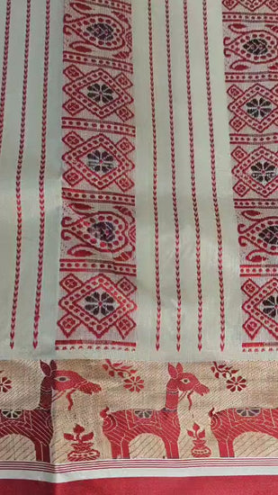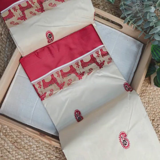 The broad red satin border features the iconic Baluchori horse motif—a symbol of strength, speed, and success—bringing depth and narrative to the weave. The pallu is a revival masterpiece, infused with the spirit of Baluchori and Assam weaving traditions, flowing long and grand for a statement of cultural richness.