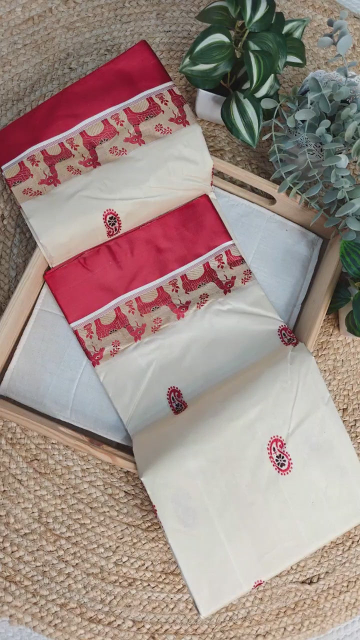 | Colour | Creamy white body with broad red satin border featuring Baluchori motifs |