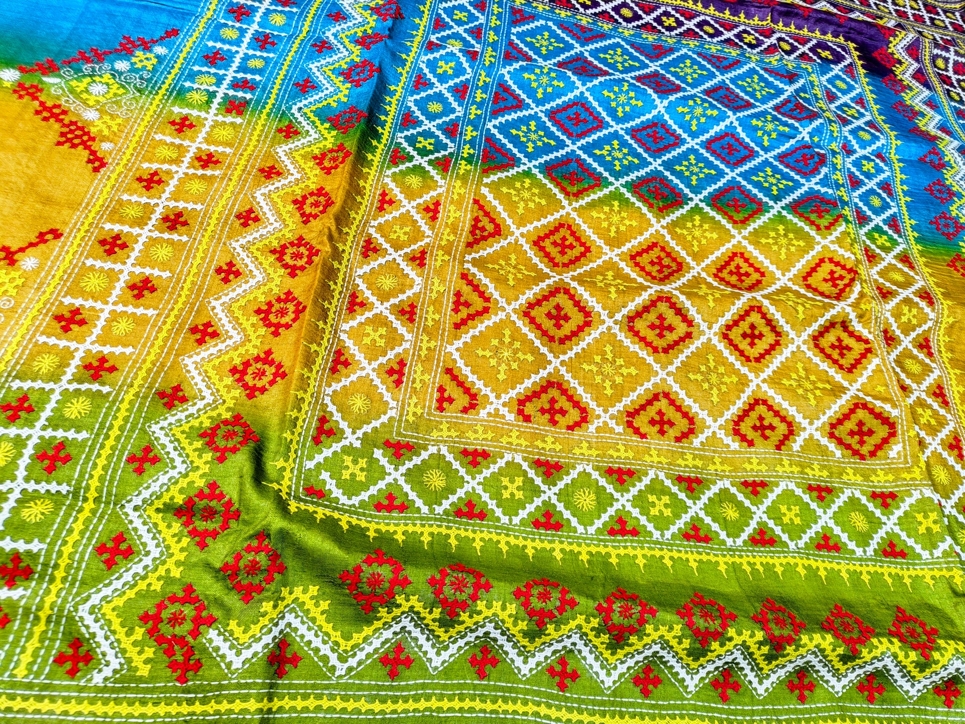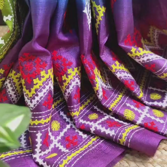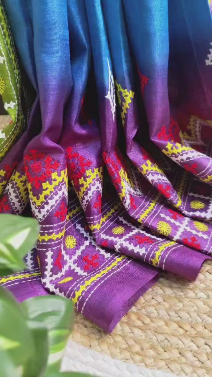 Sold out Pure Tussar Gachi Silk Kantha Saree with Vibrant Dye and Handcrafted Gujarati Embroidery