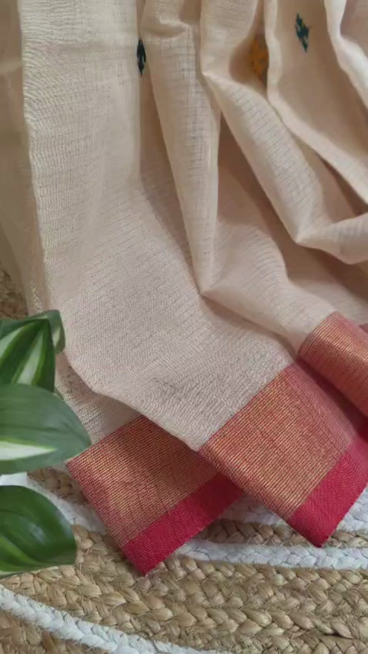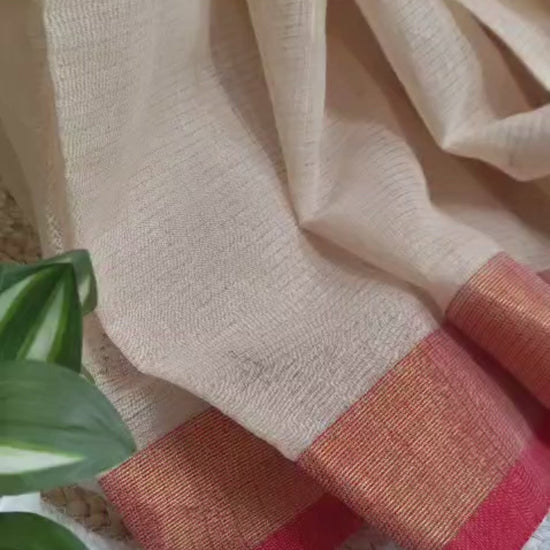 - Colour: Off-white base with a bold red zari border and satin salvage.
