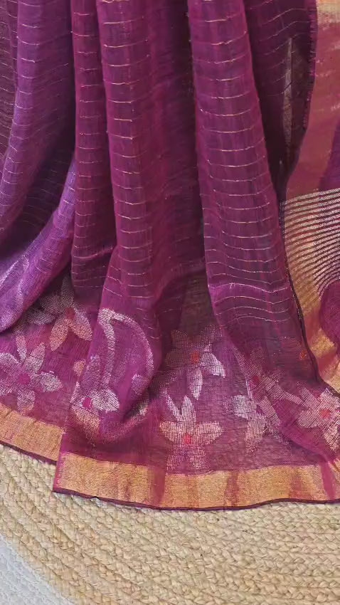 A timeless blend of elegance and craftsmanship, this handwoven Jamdani saree in linen is adorned with delicate zari thread checkwork. Lightweight and breathable, it drapes like a whisper and speaks volumes of heritage. The subtle shimmer of zari adds festive charm, while the understated weave makes it versatile for both day and evening wear.