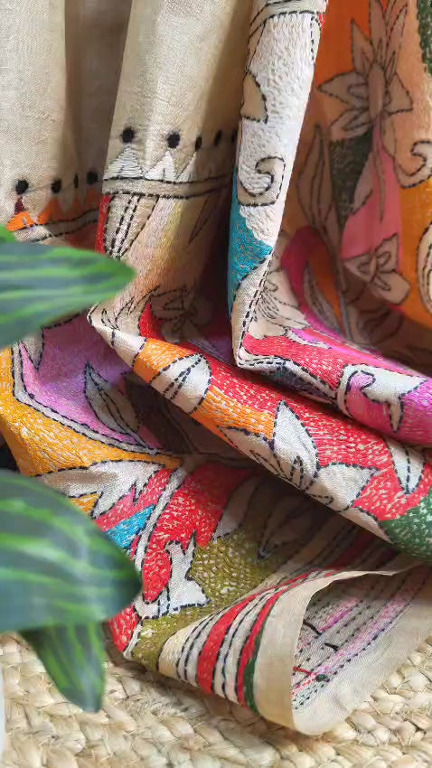 Sold out Pure Tussar Gachi by Gachi Silk Carpet Kantha Saree, Corner-to-Corner Design-Sold in Kolkata