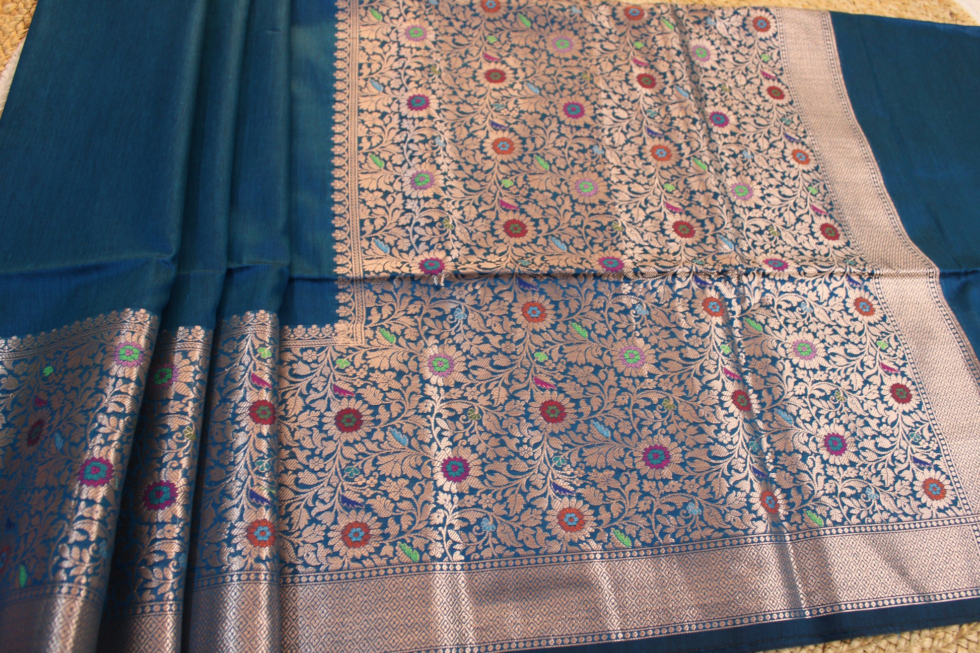Embrace sophistication with our teal blue Minakari Munga Silk saree, a true epitome of elegance and grace. This saree is crafted from premium Munga silk, celebrated for its lightweight texture, soft feel, and ease of draping, offering unmatched comfort and timeless style.