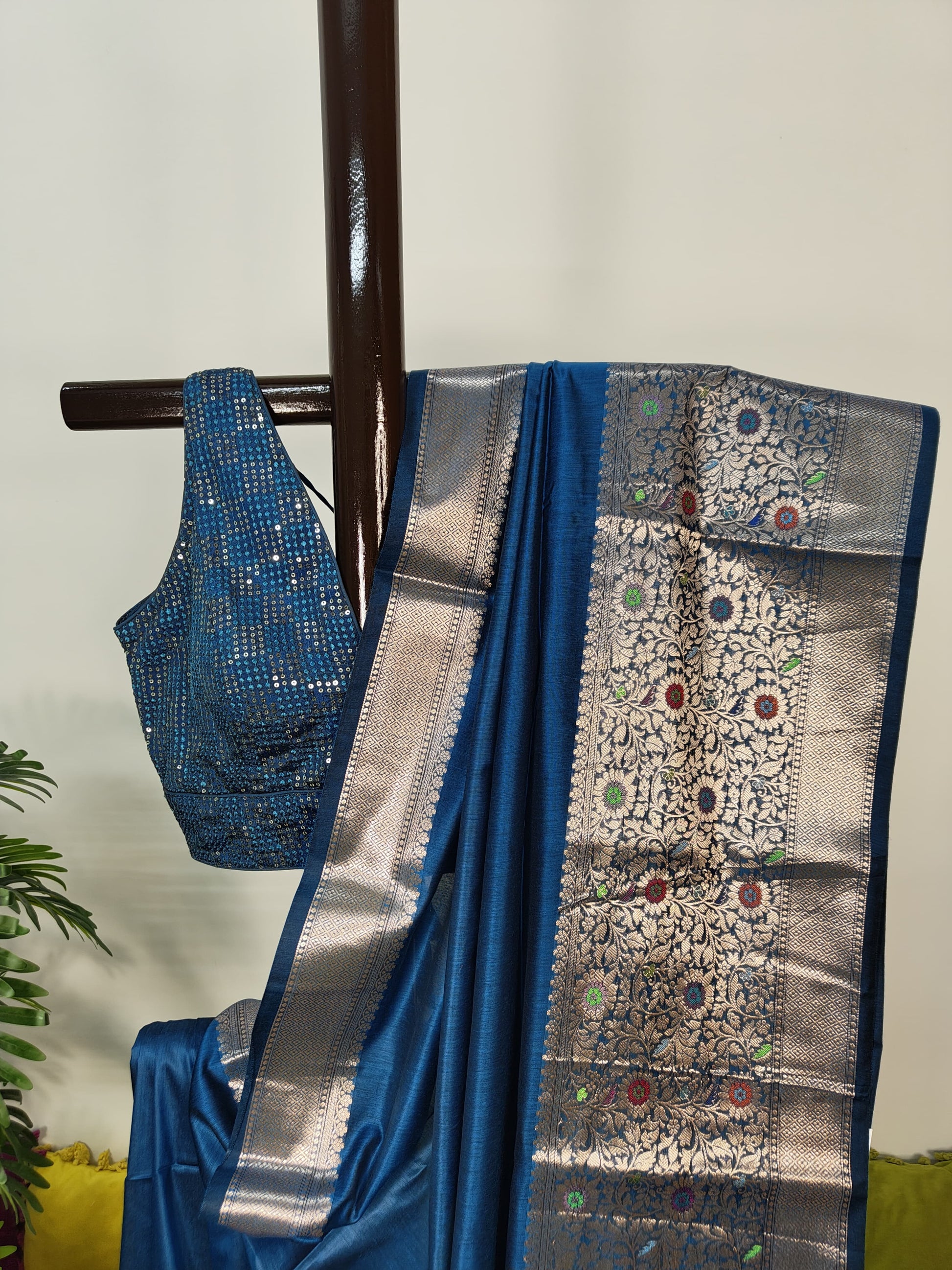 Premium Quality Minakari Semi Munga Tussar Silk Banarasi Saree