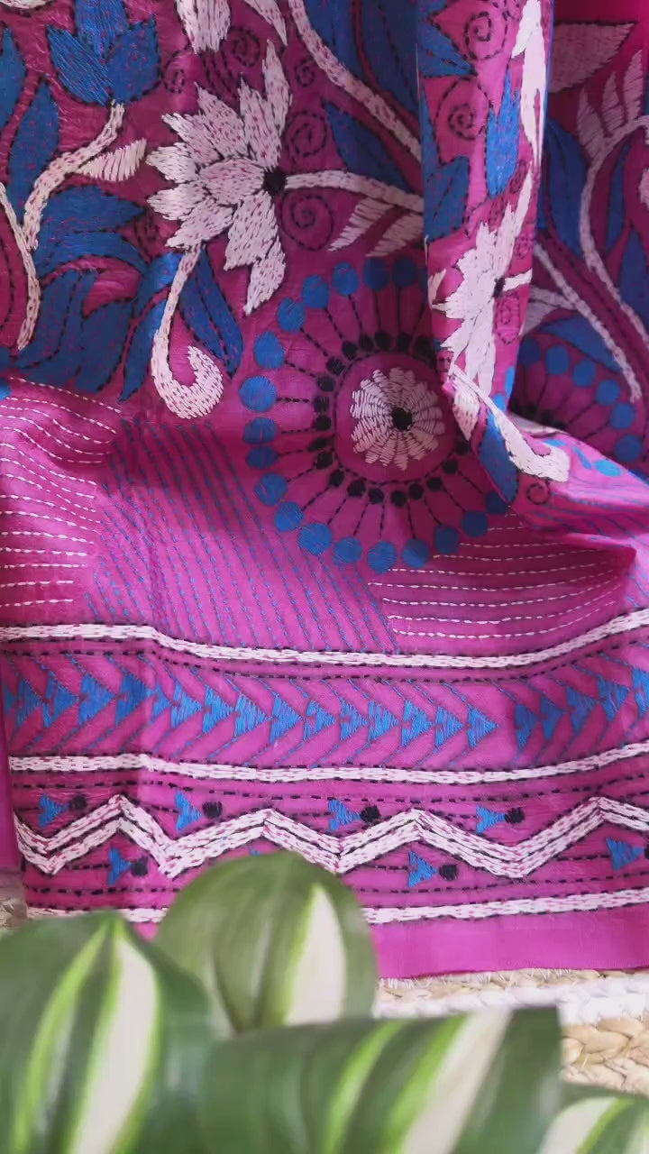 Pure Bangalore Silk Kantha Saree – Hand Embroidered Elegance