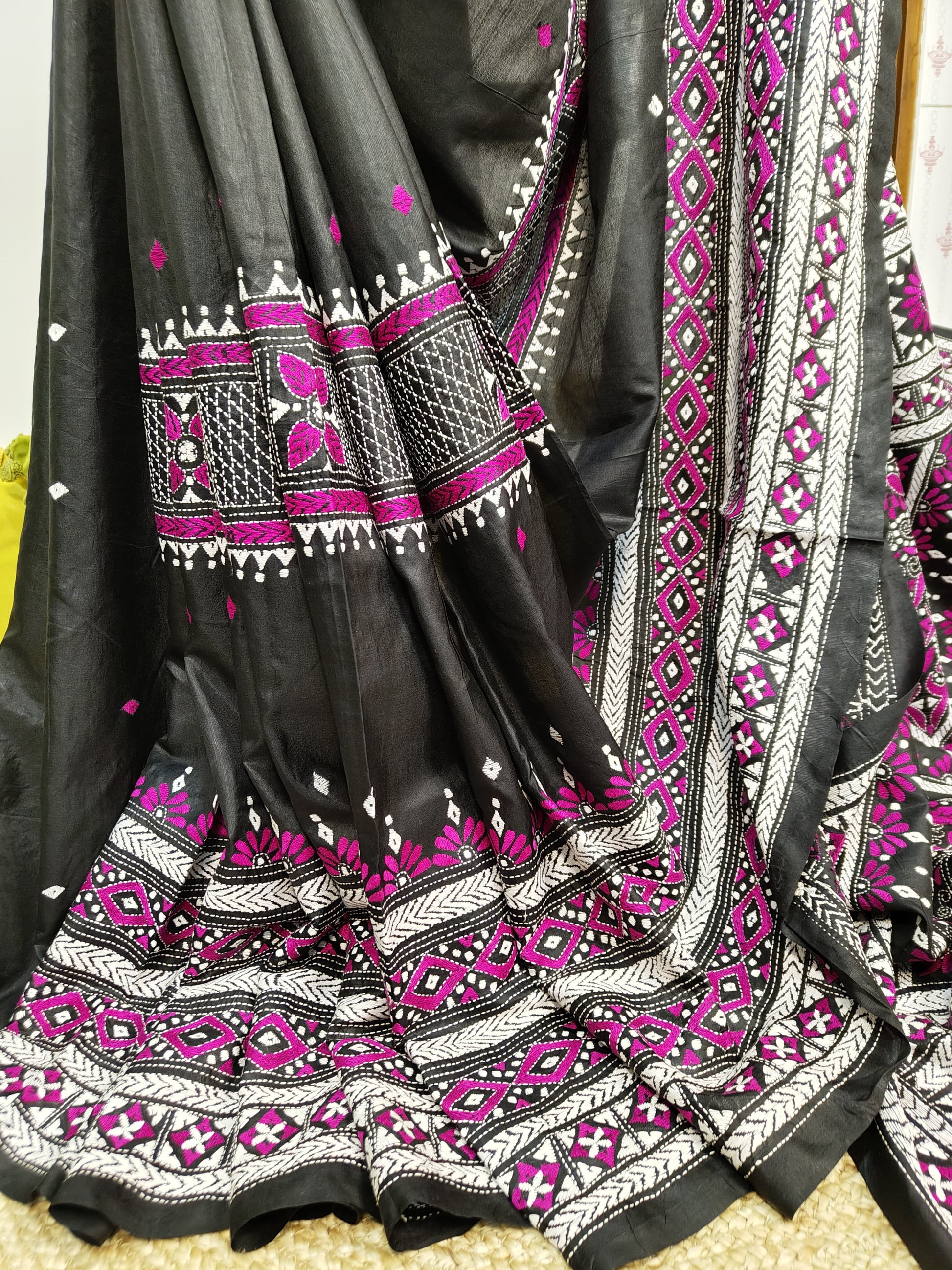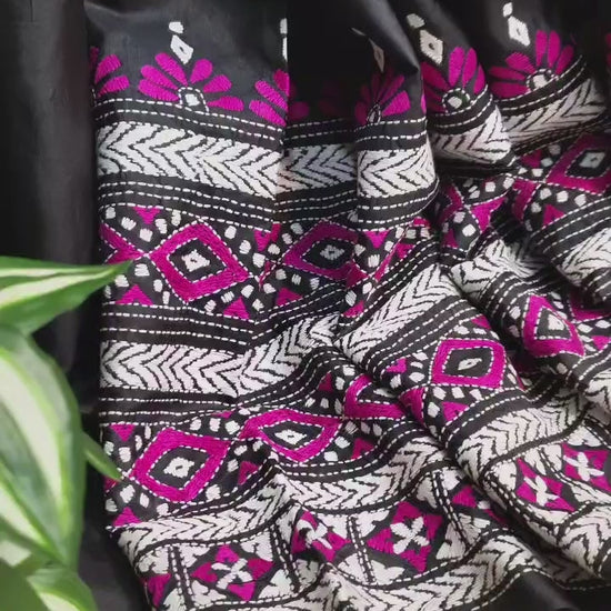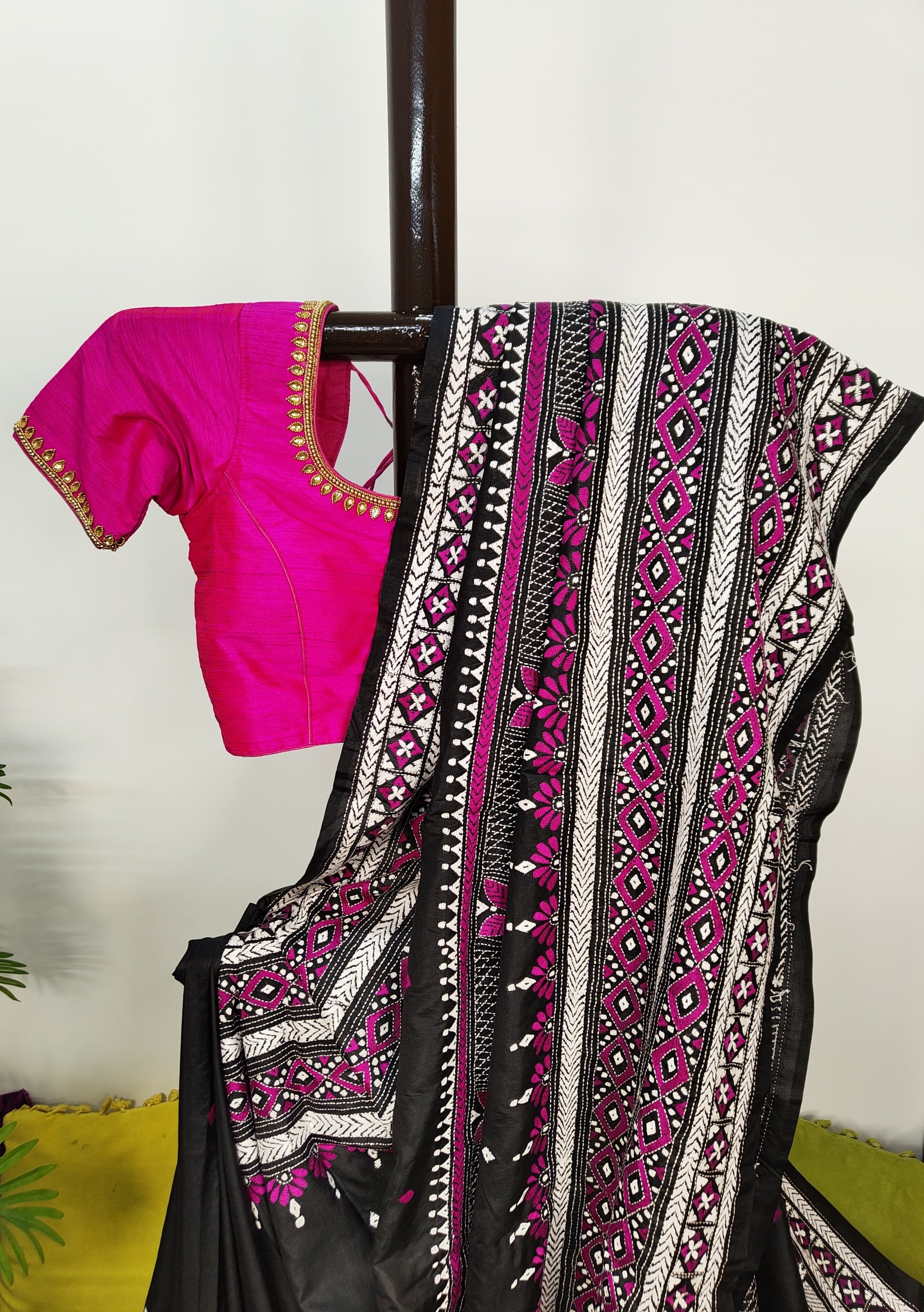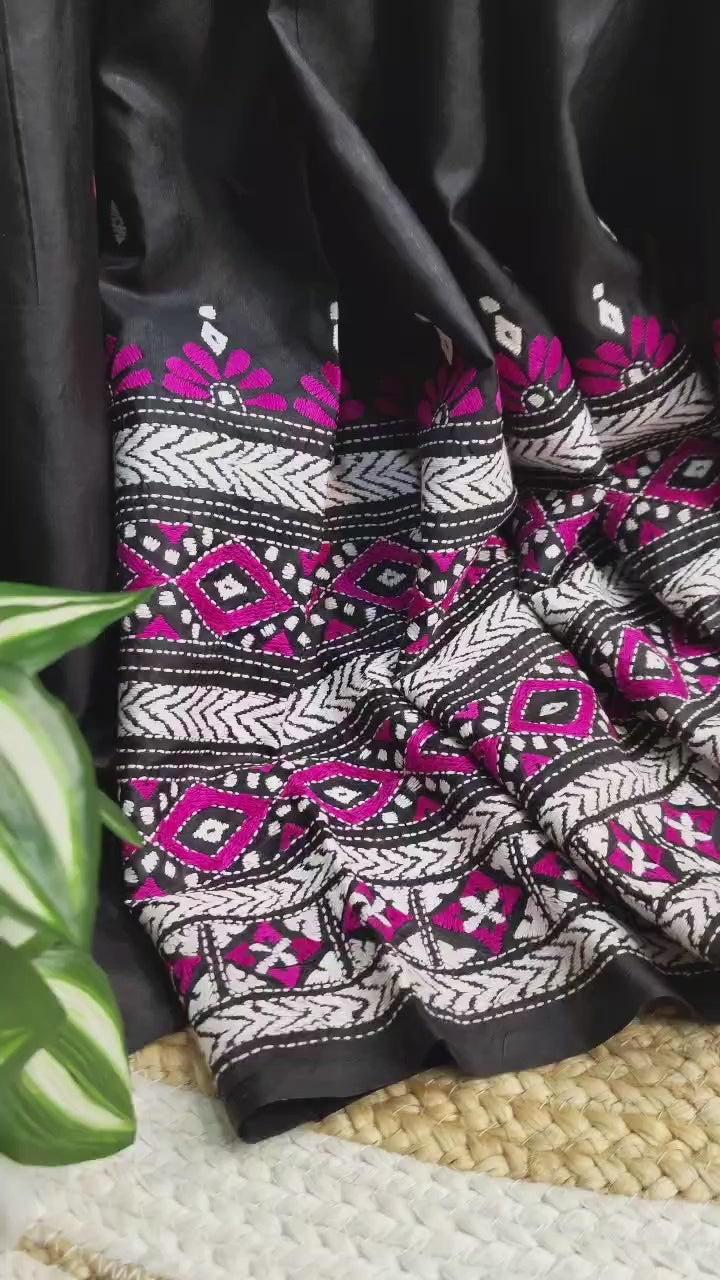 ✔️ Elegant black base with vibrant pink and white Kantha embroidery