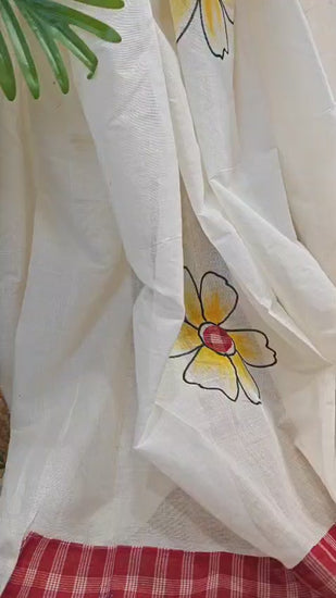 White Pure Cotton Gamcha Applique and Hand-Painted Saree