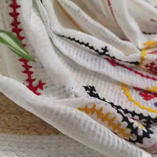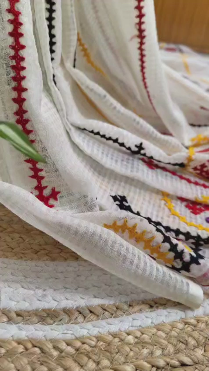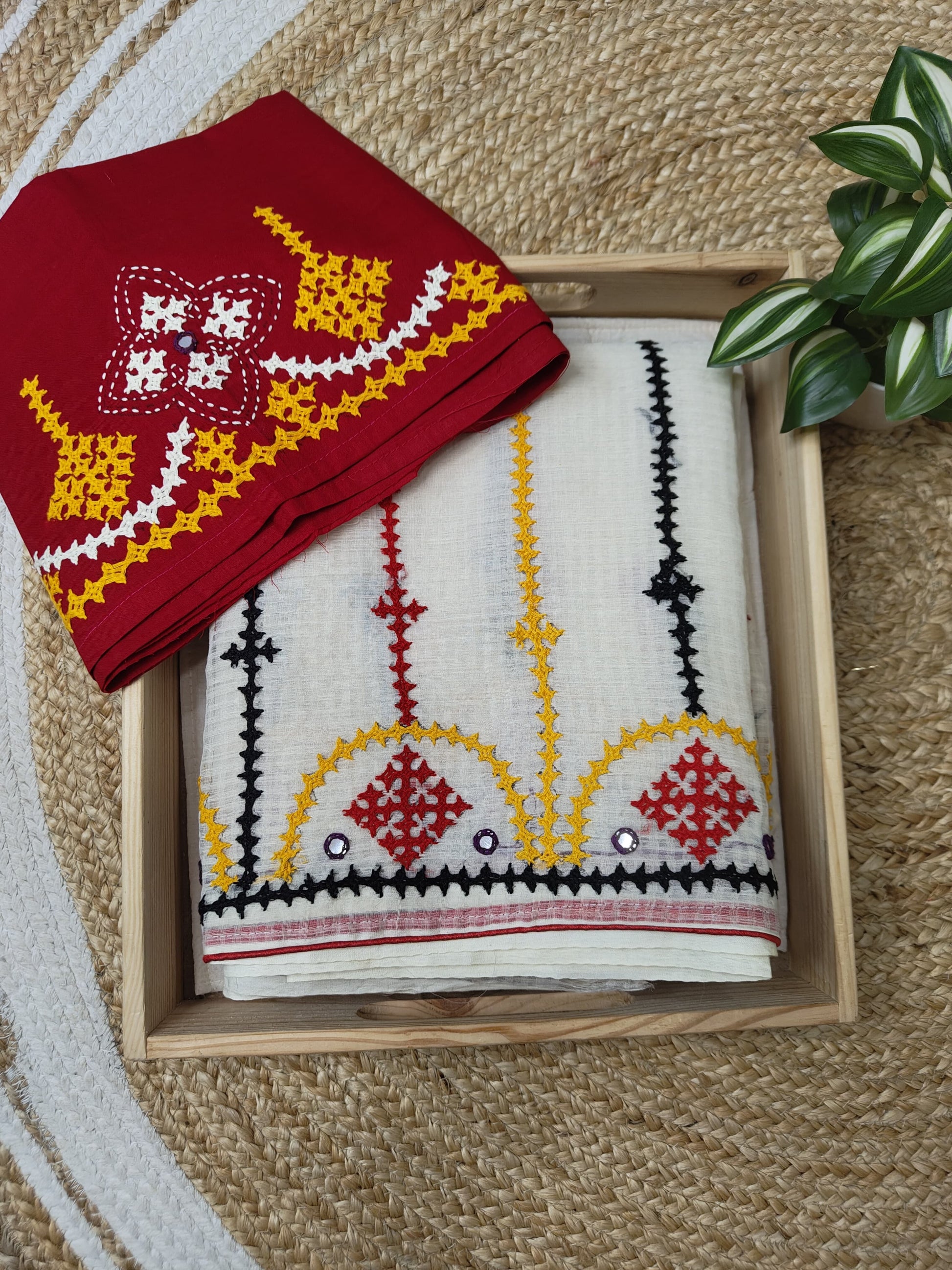 - Colour: Off-white base enhanced with multicolour Gujarati hand embroidery.