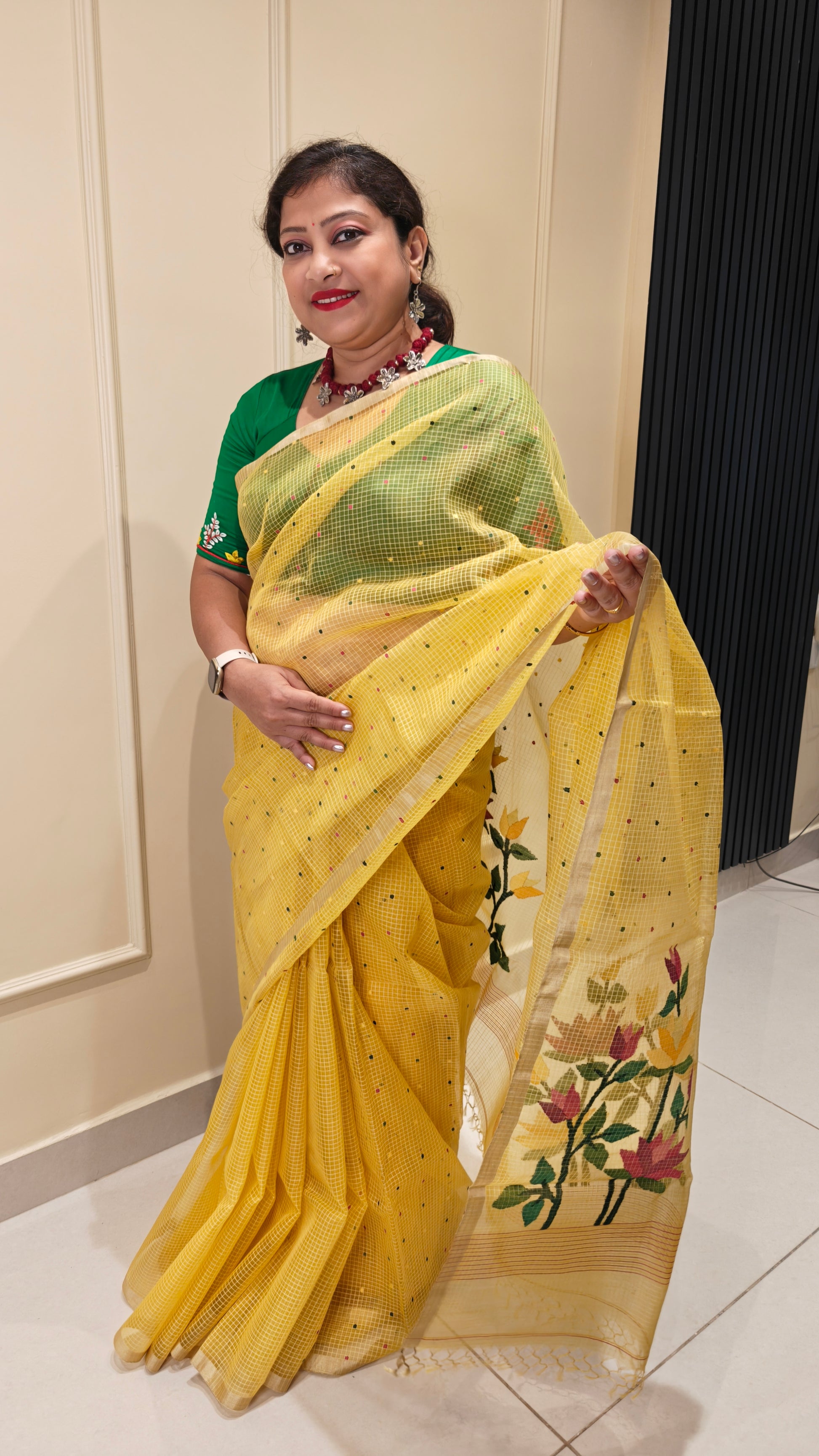 - Design: Handwoven small buttas across the body with an authentic floral pallu