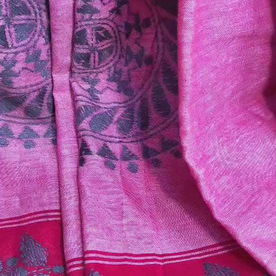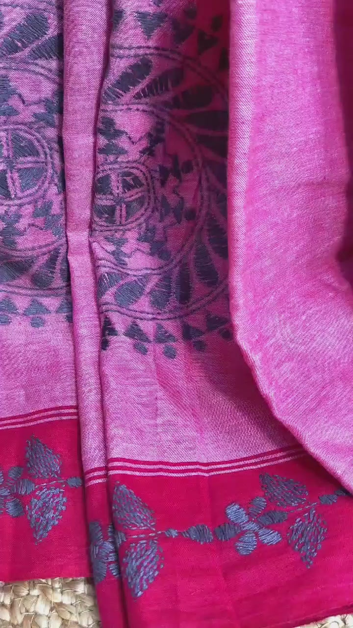 This Pure Khadi Cotton Kantha Saree, originating from the artistic hub of Shantiniketan, exudes heritage and charm. The saree features a light pink base fabric that radiates subtle elegance, complemented by a bold dark pink border. The pastel green and light pink Kantha embroidery on the pallu adds a refreshing and artistic touch. The entire body is adorned with circle motif Kantha embroidery, showcasing intricate craftsmanship and cultural beauty.