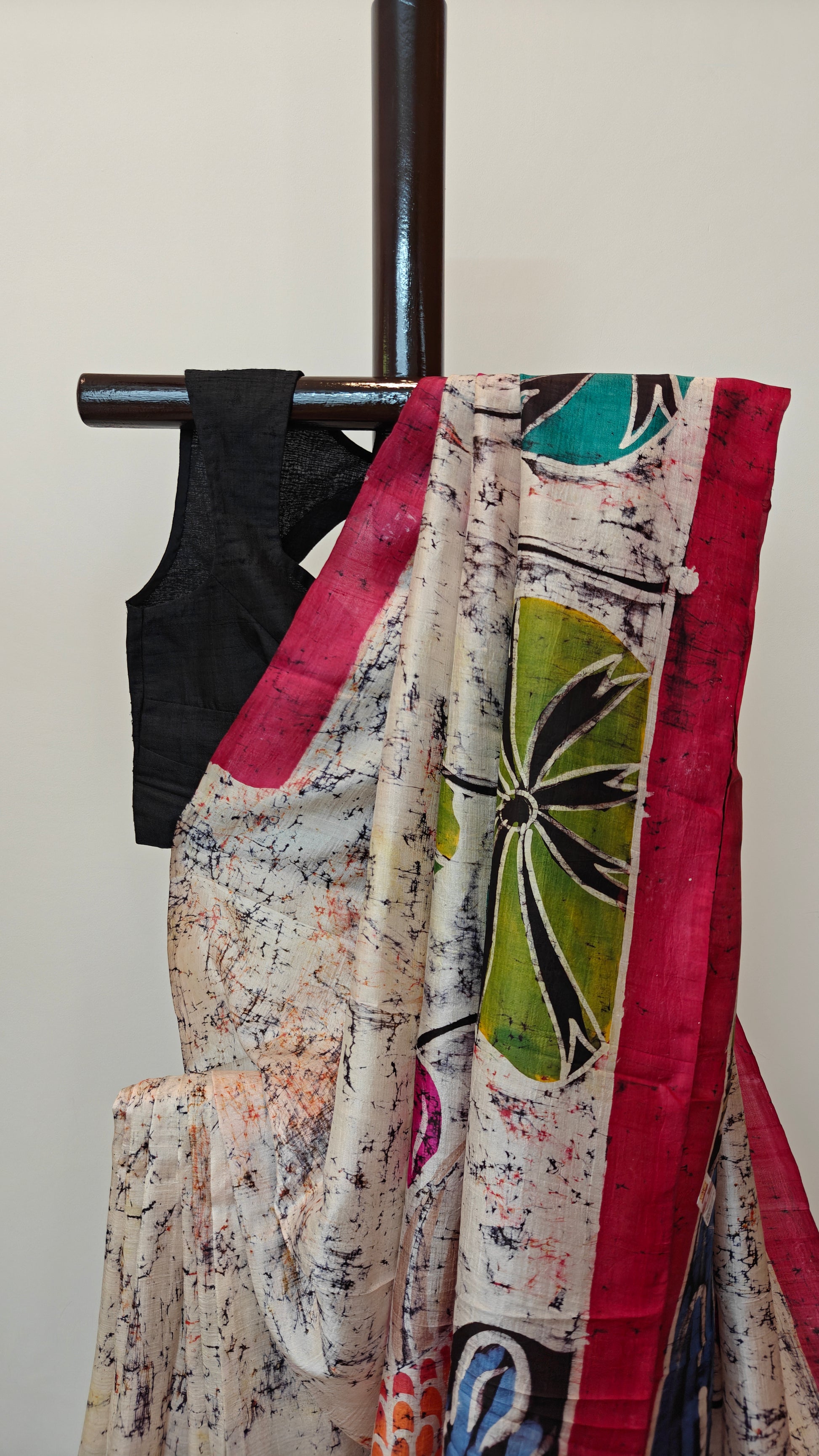 Pure Murshidabad 3-Ply Silk Mom batik Hand painted Saree – Nature’s Canvas in Silk