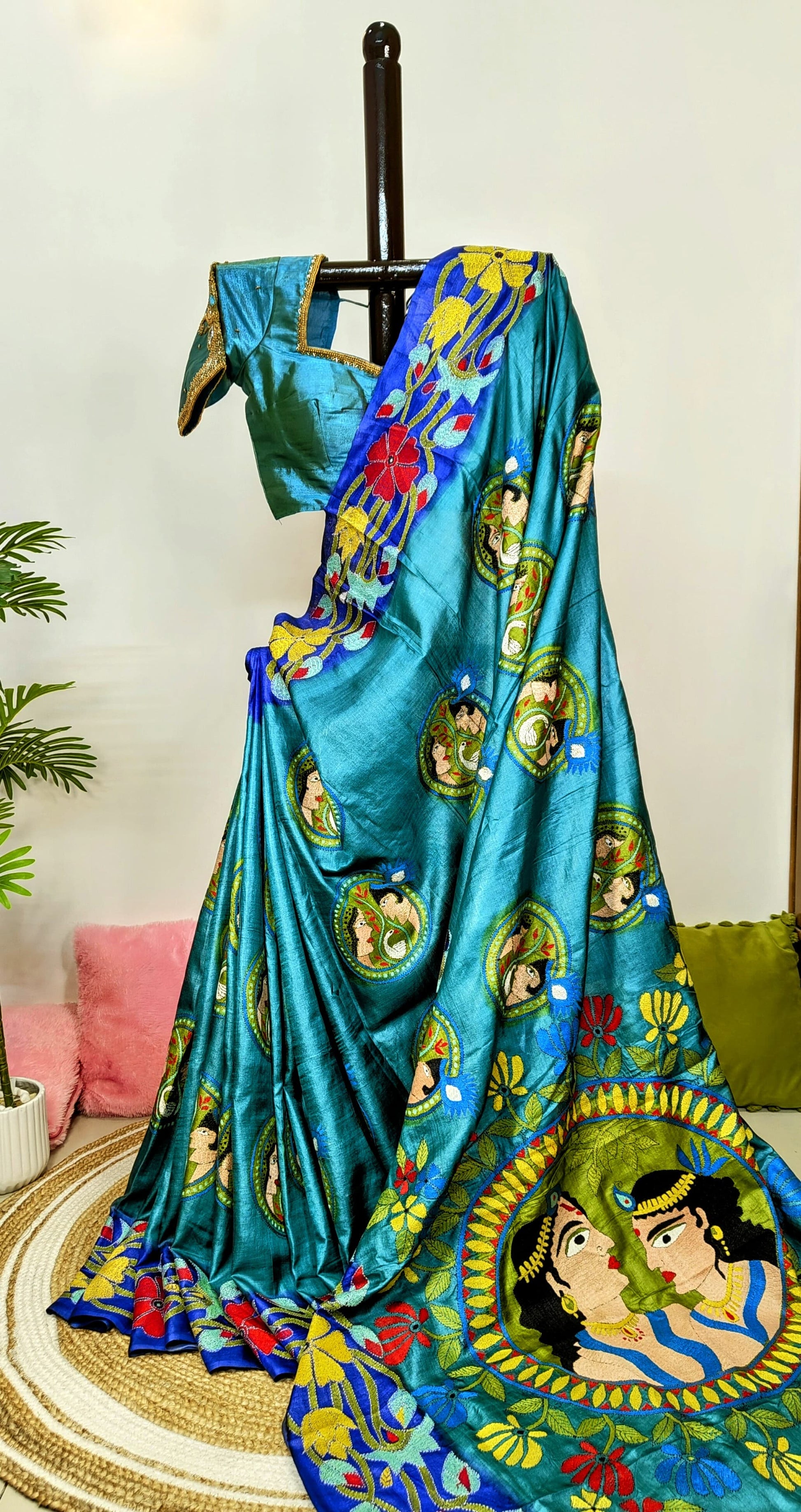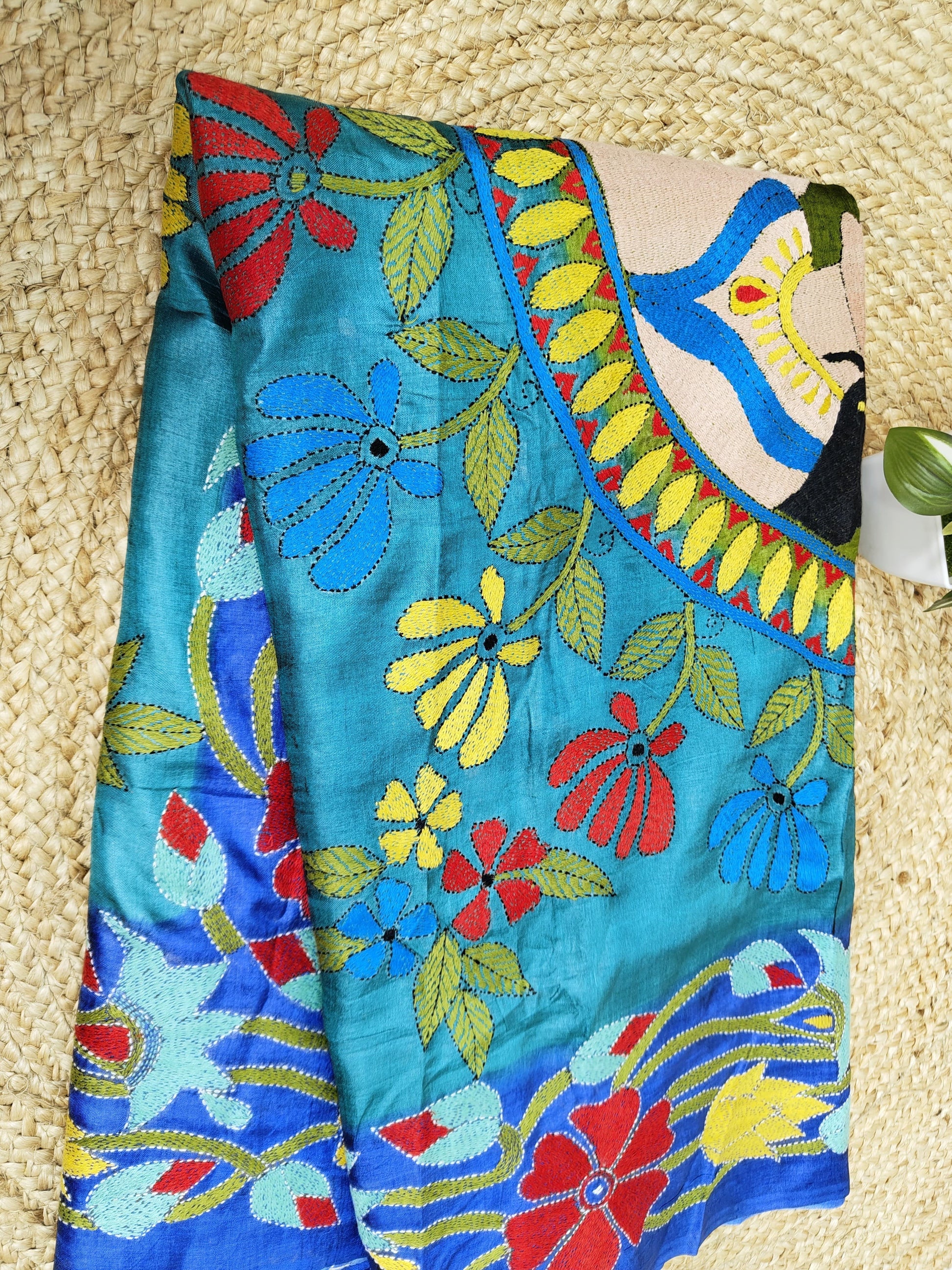This Deep Sea Green Kathakali Concept Saree is a striking blend of artistry and tradition, crafted from gachi by gachi tussar silk, celebrated for its soft, smooth texture and natural sheen. Adorned with intricate hand-embroidered Kantha work, the saree reflects a rich cultural heritage and fine craftsmanship. The contrast blue border with floral motifs adds a vibrant touch, while the attached contrast blue blouse with broad floral Kantha embroidery completes this sophisticated ensemble. Certified with the Silk Mark, this saree guarantees authenticity and premium quality.