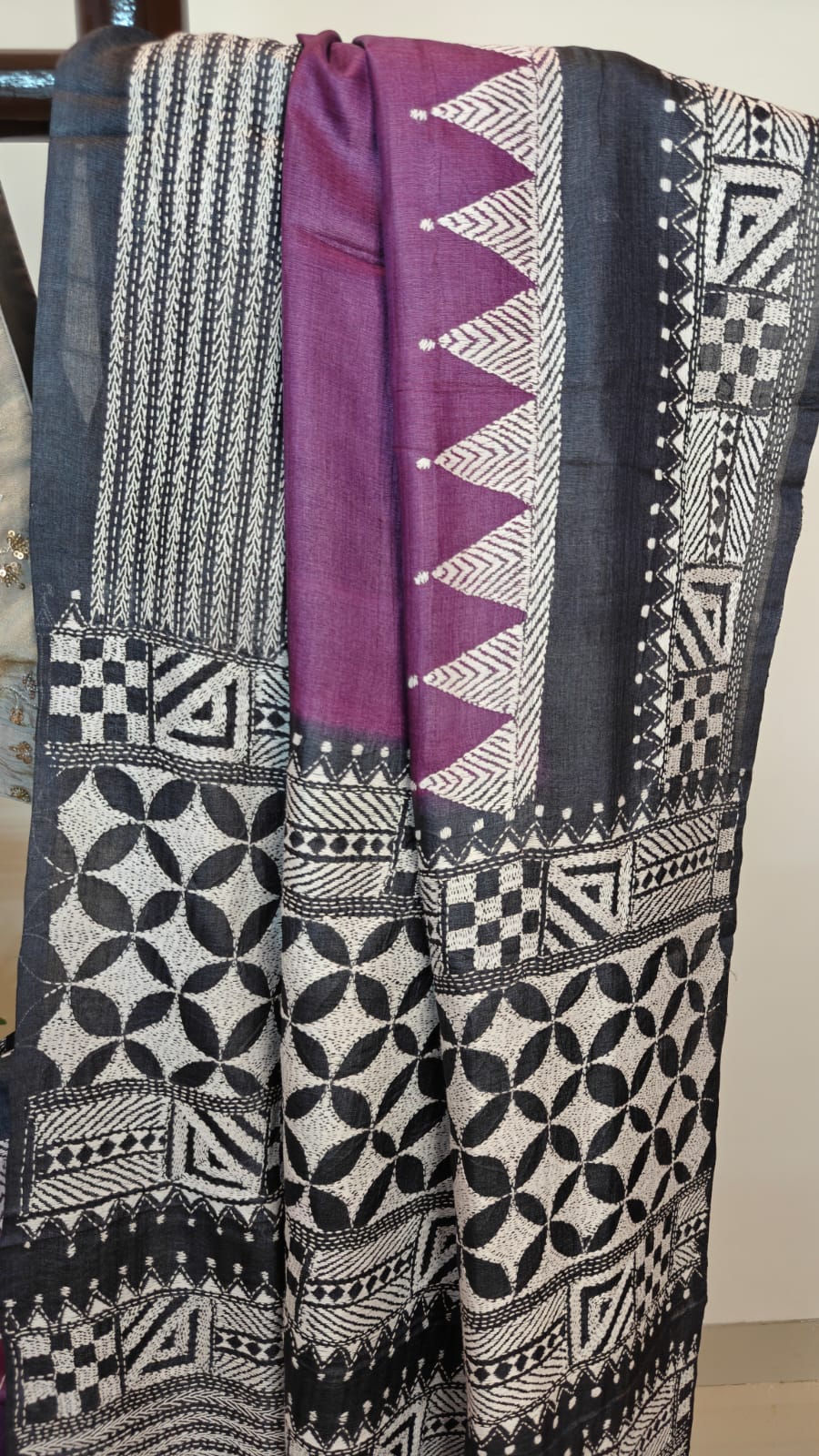 The base, dyed in a rich wine hue, is beautifully offset by a harmonious interplay of grey and soft white Kantha threadwork. Intricate leaf and geometric motifs dance across the body, while dense Kantha embroidery graces the skirt border, pallu, and edges—each stitch a testament to artisanal devotion.