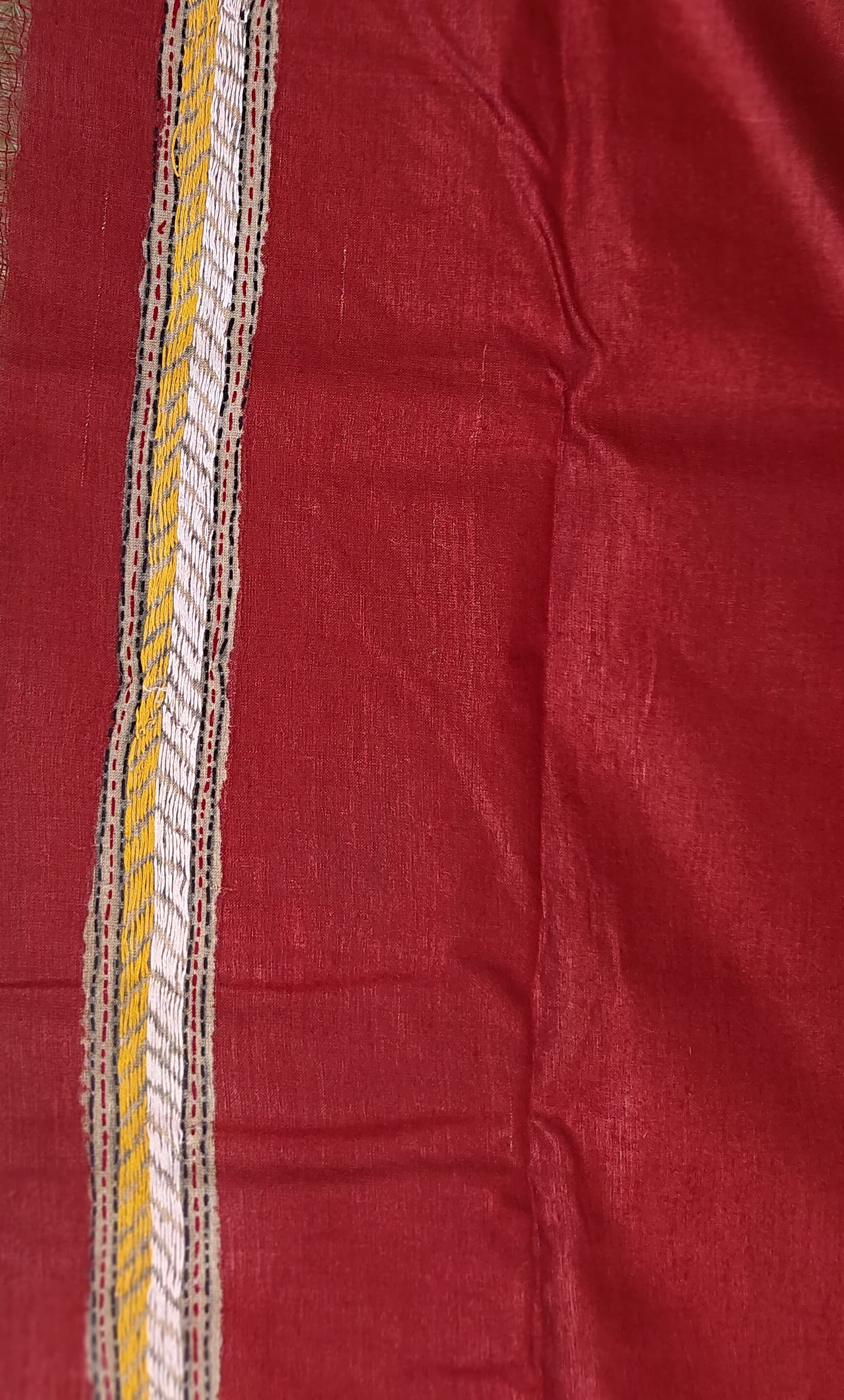- Includes a matching cherry red blouse piece with Kantha hand embroidery on the sleeves.