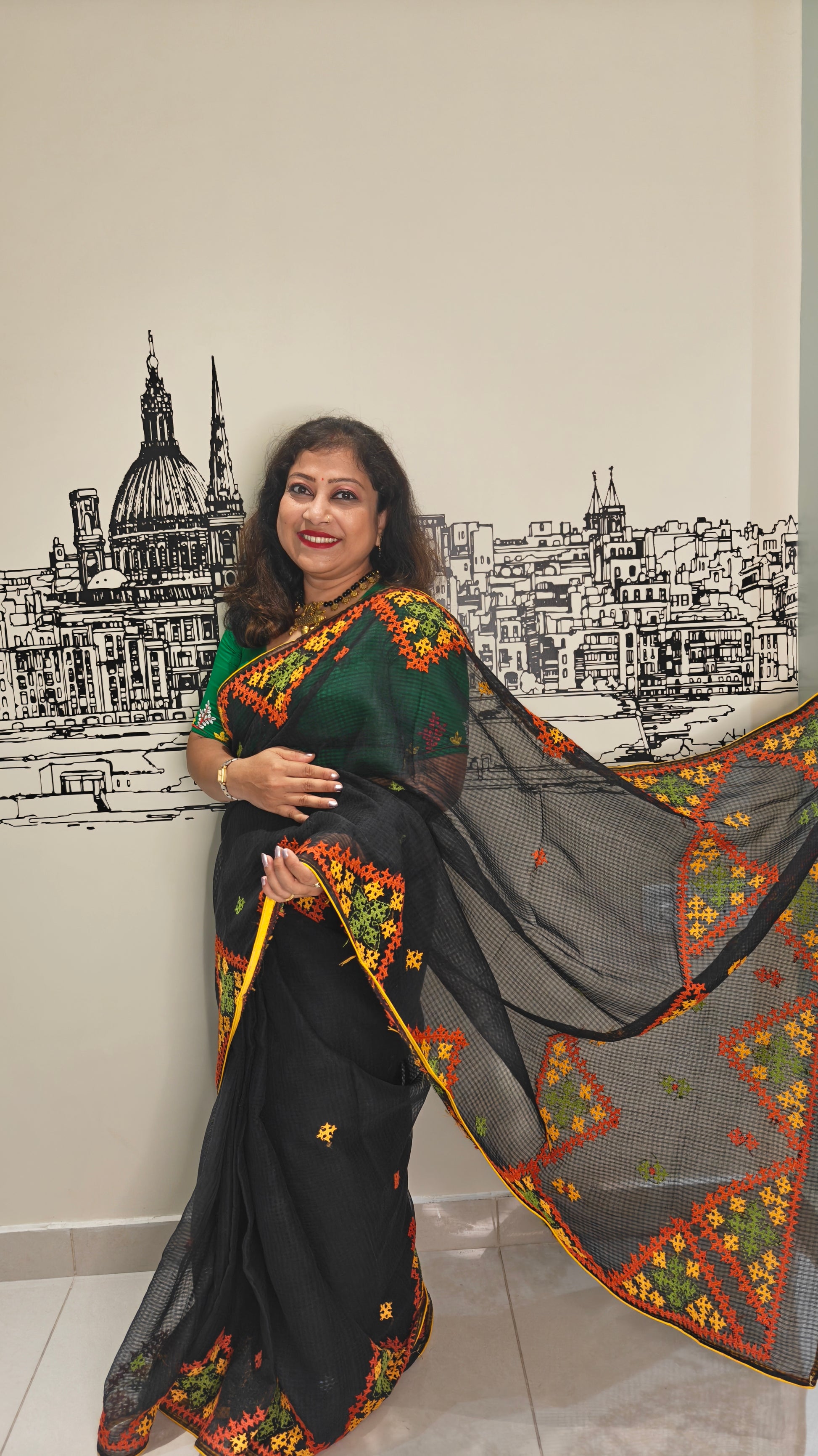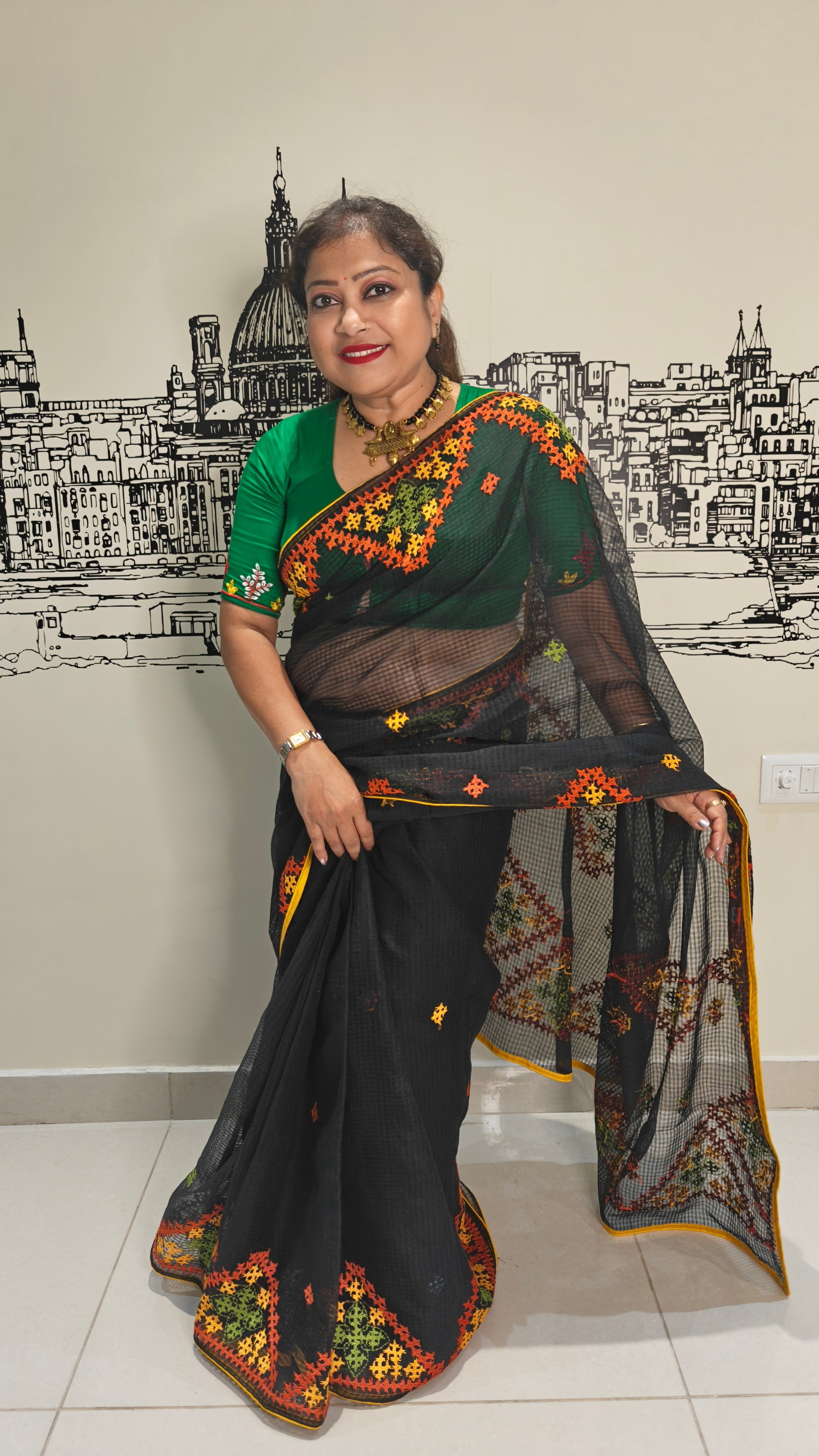 This saree is a delicate masterpiece of craftsmanship, woven from pure Resham Kota fabric, celebrated for its lightweight, airy, and sheer texture. The Black base exudes a subtle elegance, beautifully adorned with intricate, vibrant, and artistic Gujarati hand embroidery, featuring multicolour threadwork inspired by the rich heritage of Kutch. The exquisite detailing brings a harmonious blend of tradition and artistry, making this saree both graceful and timeless.