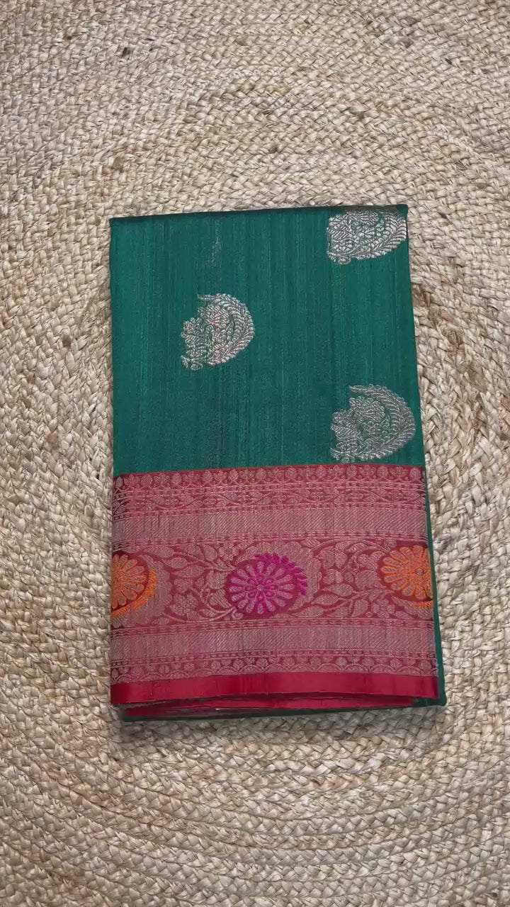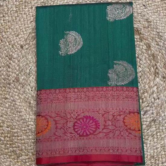Elevate your elegance with our exquisite bottle green colour Tussar Raw Silk Benarasi saree, featuring a vibrant red floral motif woven border and palla. This handloom masterpiece, crafted with care and certified by the Government Silk Mark, embodies tradition and luxury.